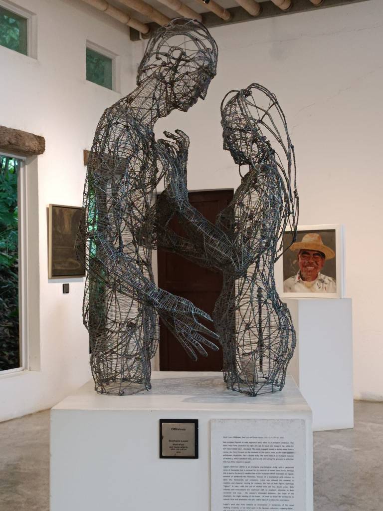 Another personal favorite sculpture I encountered at Pinto Art Museum is “Oblivious” by Stephanie Lopez. This captivating piece, located within one of the galleries, depicts a scene of intimacy between two lovers. Created from delicate steel wires and found objects, the sculpture captures the essence of a tender connection. The lovers, seemingly oblivious to the world around them, are locked in a silent embrace. The use of light and shadow adds a touch of fragility to the piece, while the found objects incorporated into the sculpture hint at a deeper story waiting to be unraveled. “Oblivious” serves as a beautiful testament to the power of love and the importance of cherishing those special moments of connection.